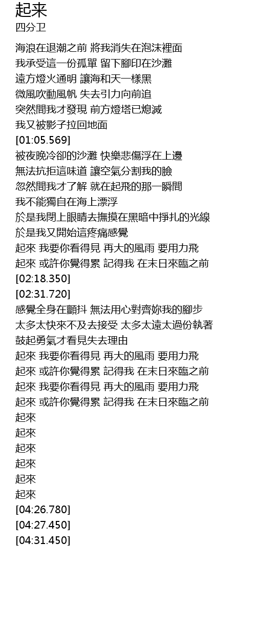 | [03:22.450] | 起來 或許你覺得累 記得我 在末日來臨之前 |