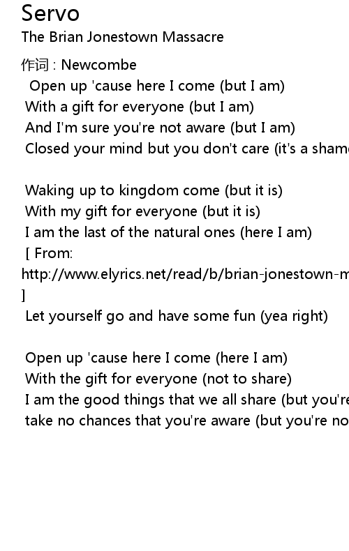 | From: http: www. elyrics. net read b brianjonestownmassacrelyrics servolyrics. html | |