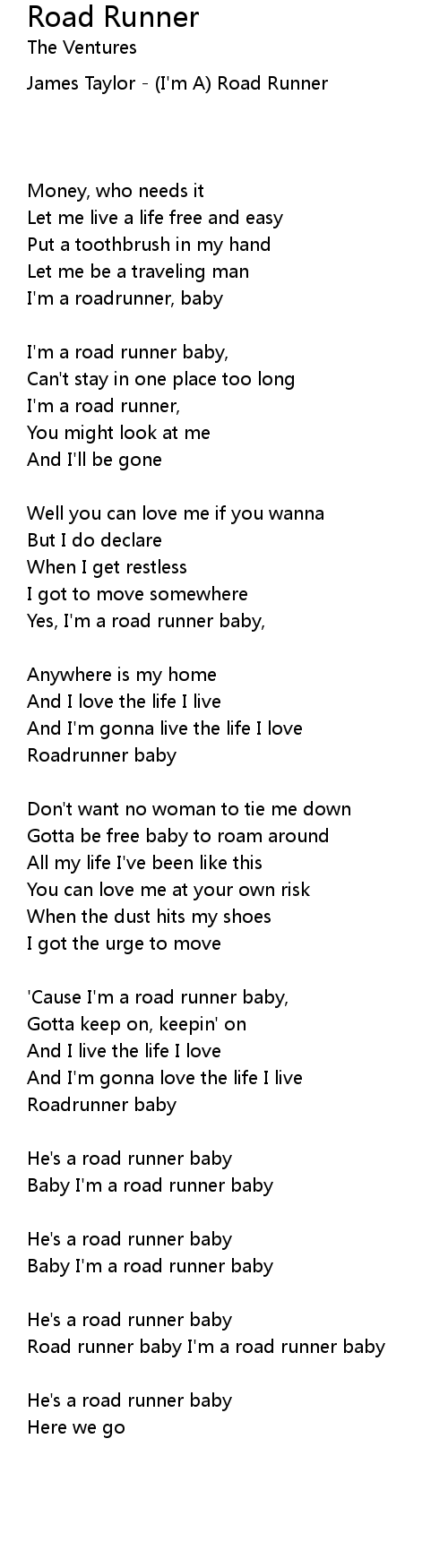 Road runner baby I'm a road runner baby |