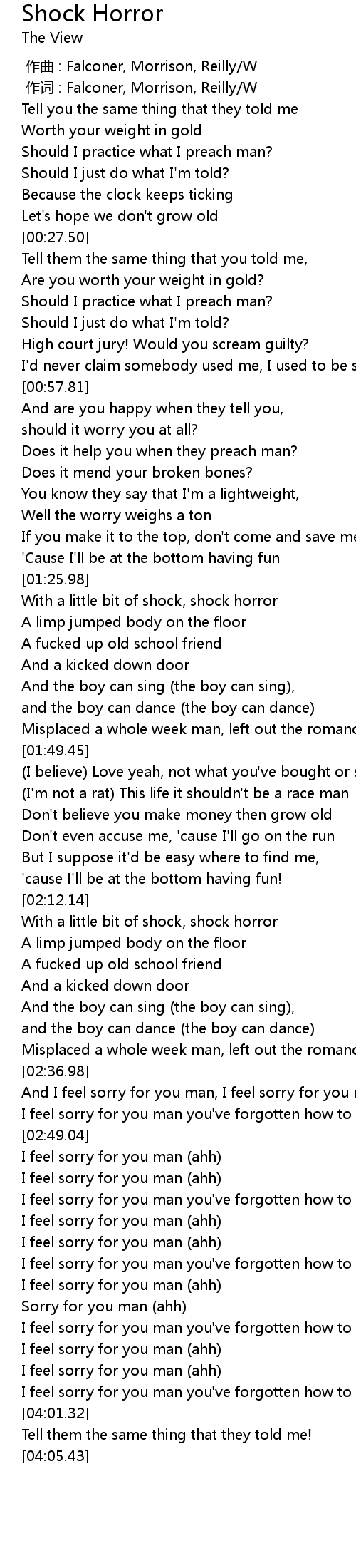 | [01:26.97] | With a little bit of shock, shock horror |