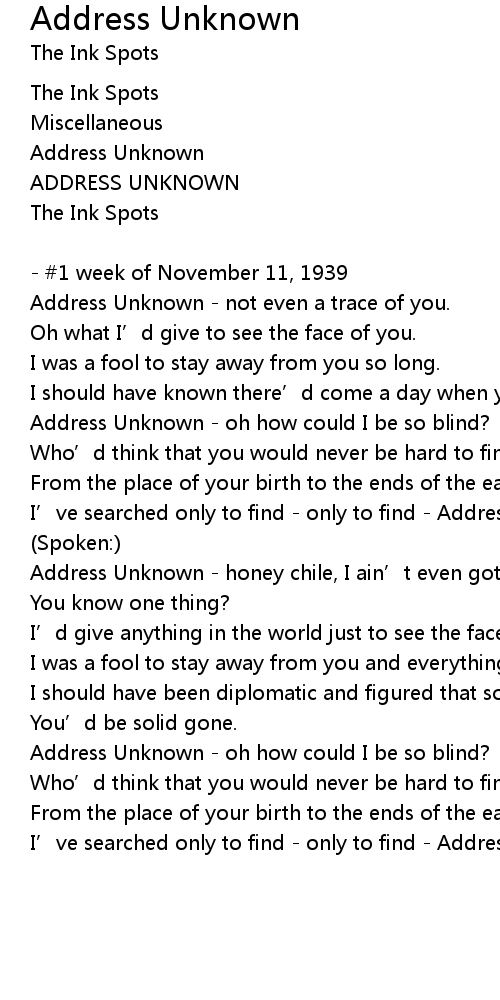 | Address Unknown honey chile, I ain' t even got a trace of ya. | |