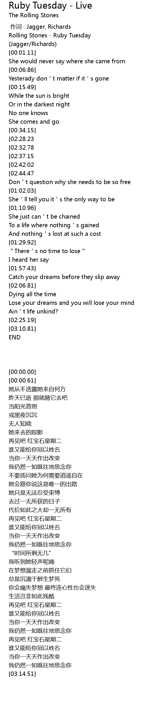 | [02:46.61][02:28.23][01:32.96][00:37.45] | Goodbye Ruby Tuesday |