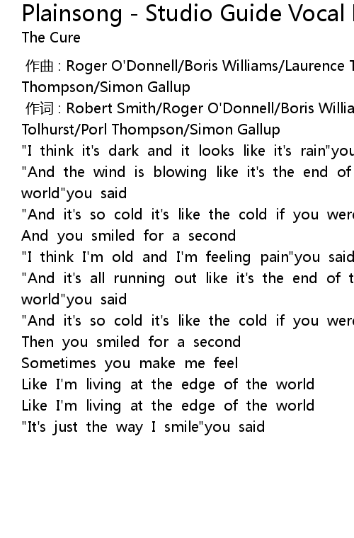 | [00:00.00] | zuo qu : Roger O' Donnell Boris Williams Laurence Tolhurst Porl Thompson Simon Gallup |