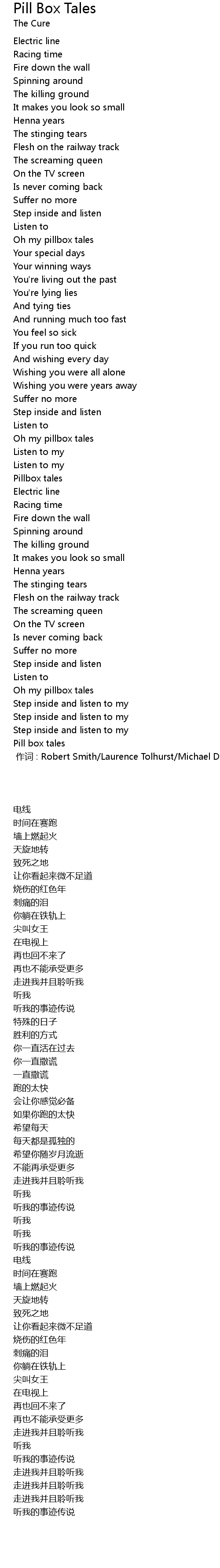 | [00:00.00] | zuò cí : Robert Smith Laurence Tolhurst Michael Dempsey |