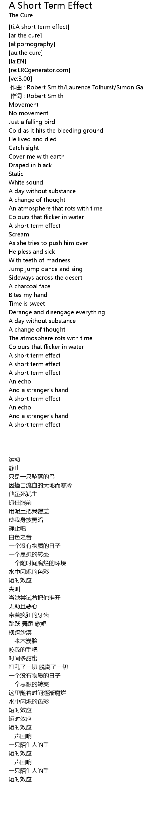 | [00:00.00] | 作曲 : Robert Smith/Laurence Tolhurst/Simon Gallup |