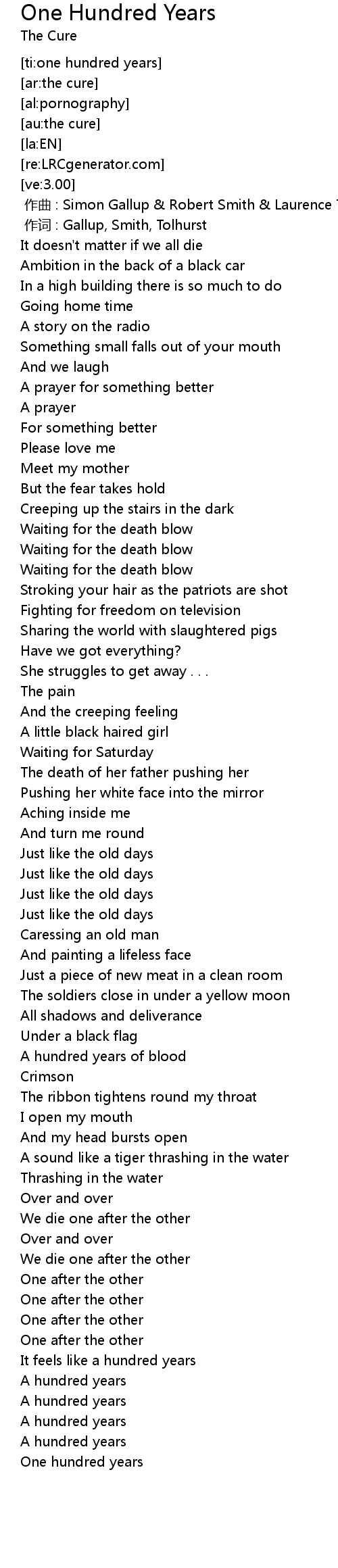 | [00:00.00] | zuo qu : Simon Gallup Robert Smith Laurence Tolhurst |