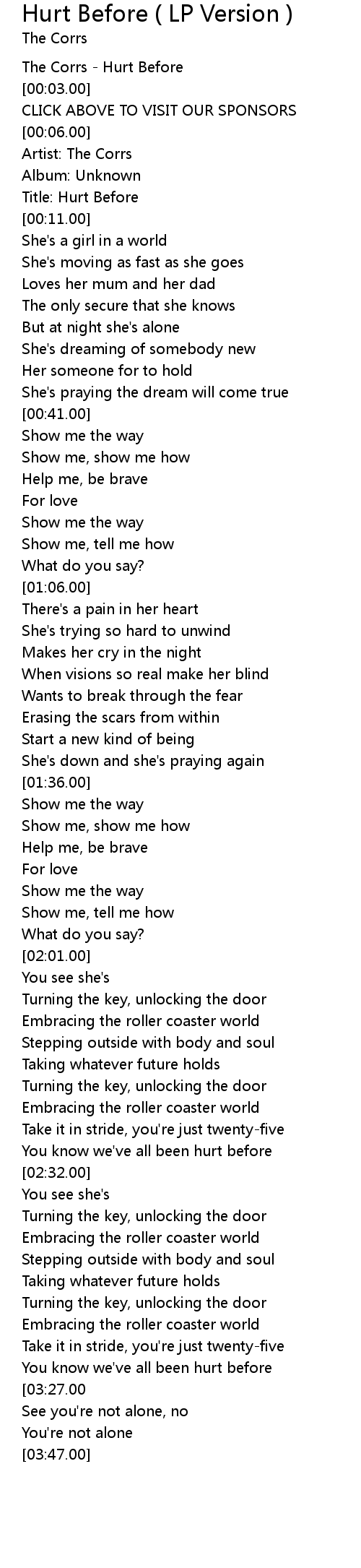 | [00:00.00] | The Corrs - Hurt Before |