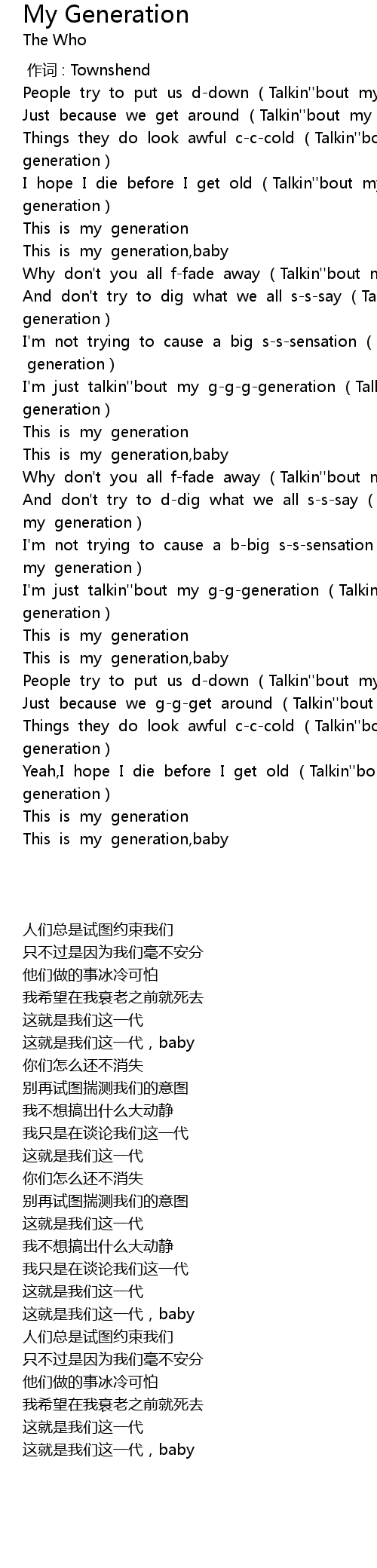 | [00:35.119] | Why don' t you all ffade away Talkin'' bout my generation |
