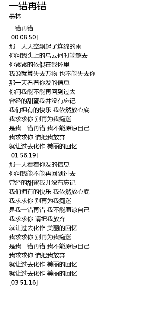 [02:51.27] shi wo yi cuo zai cuo wo bu neng yuan liang zi ji