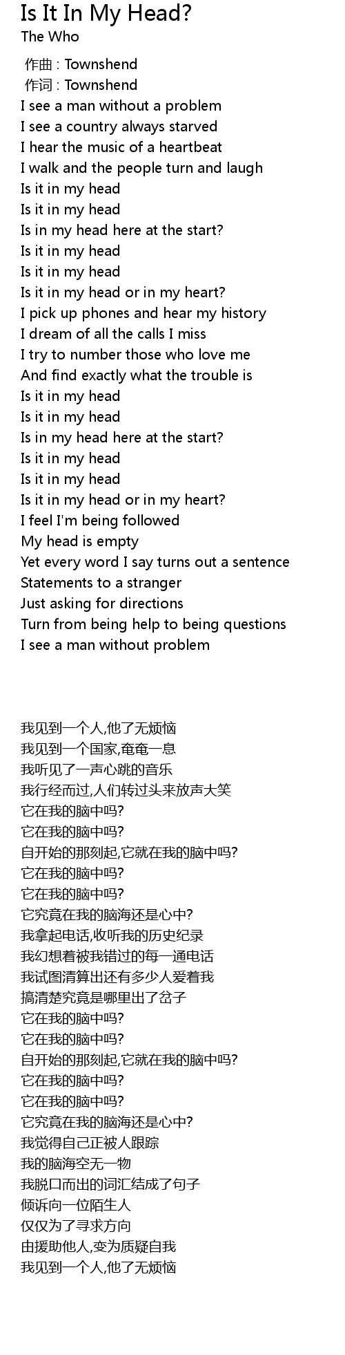 | [00:01.00] | 作词 : Townshend |