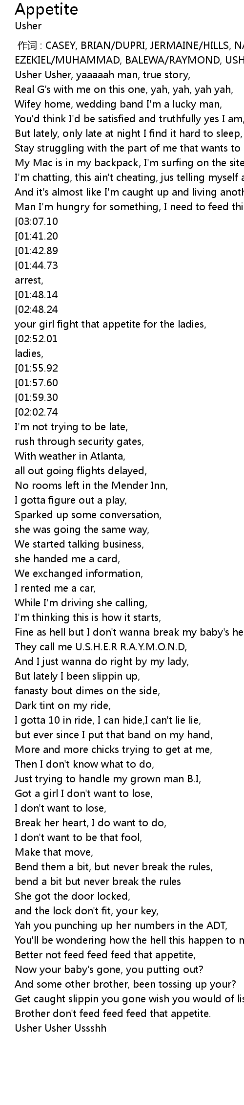 | [00:00.00] | 作词 : CASEY, BRIAN/DUPRI, JERMAINE/HILLS, NATE/LEWIS, EZEKIEL/MUHAMMAD, BALEWA/RAYMOND, USHER/SEAL, MANUEL |