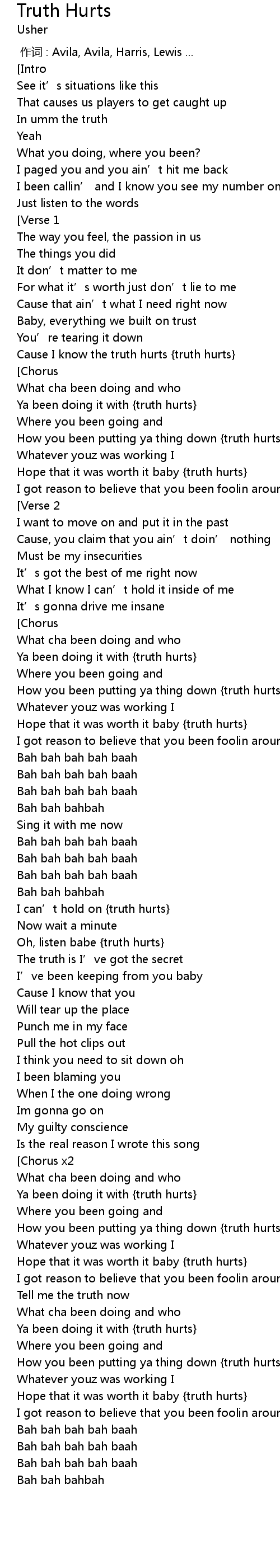 | [01:45.73] | Ya been doing it with {truth hurts} |
