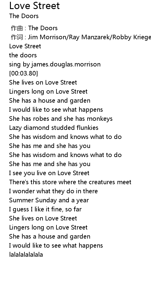 | [00:00.14] | zuo ci : Jim Morrison Ray Manzarek Robby Krieger John Densmore |