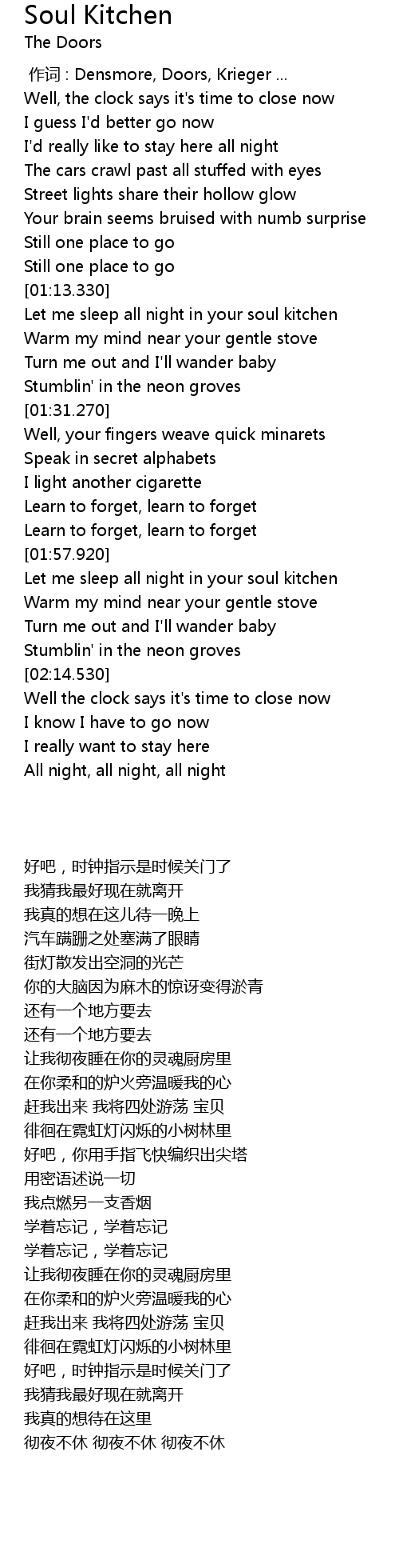 | [01:14.450] | Let me sleep all night in your soul kitchen |