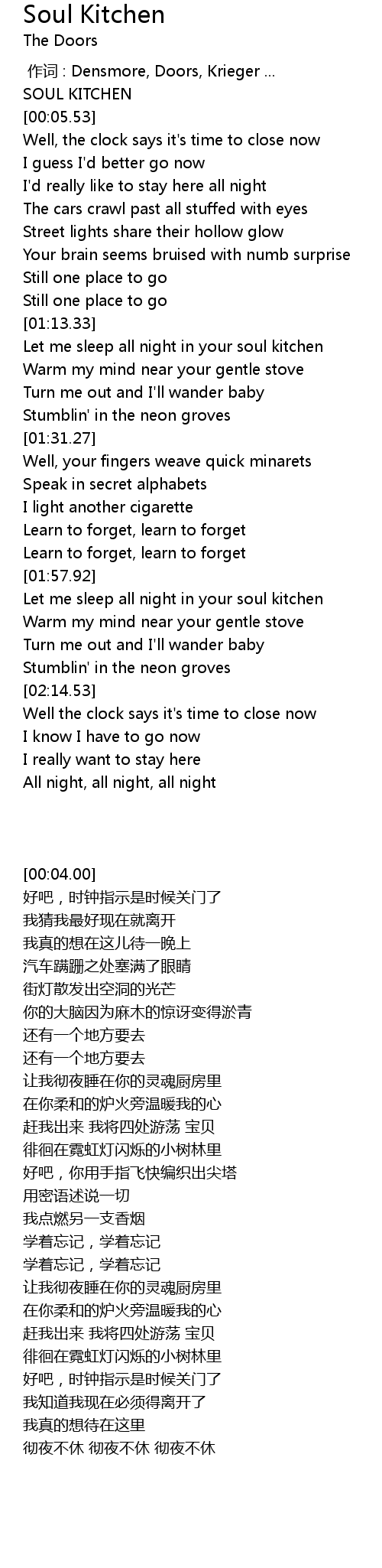 | [01:14.45] | Let me sleep all night in your soul kitchen |