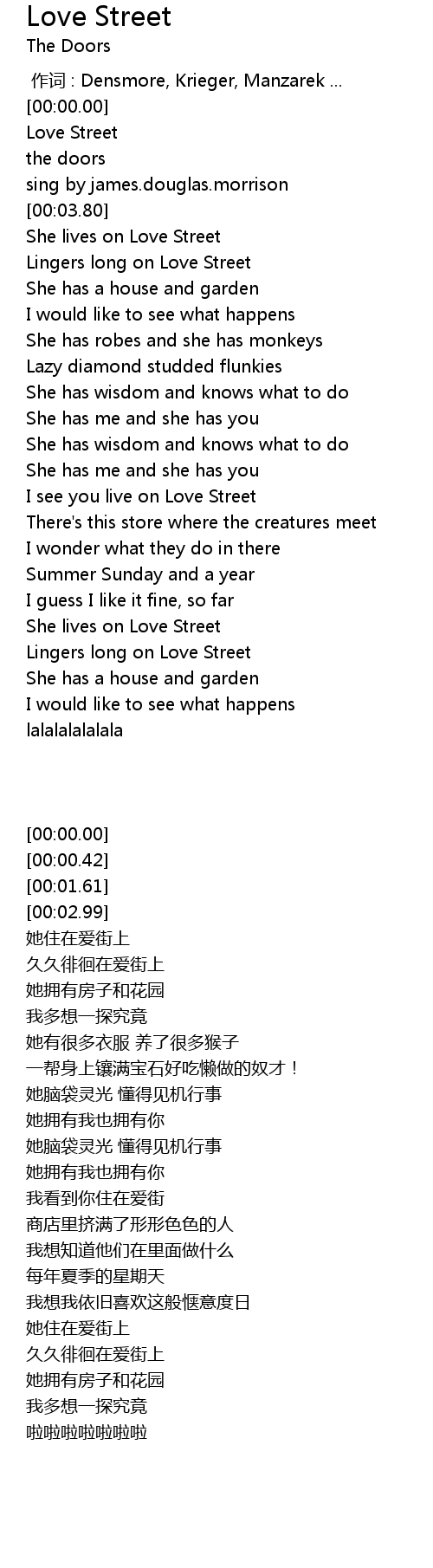 | [00:00.00] | 作词 : Densmore, Krieger, Manzarek ... |