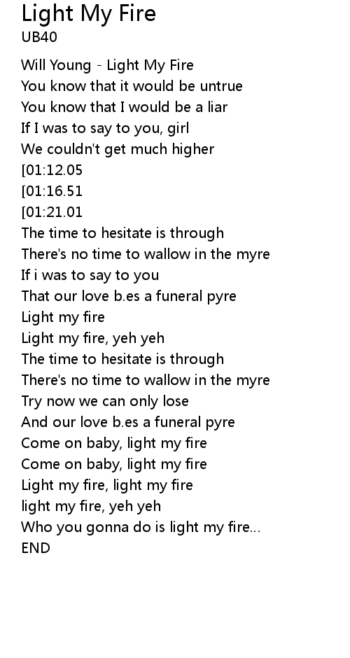 | [02:23.57][01:16.51][00:43.01] | Come on baby, light my fire |