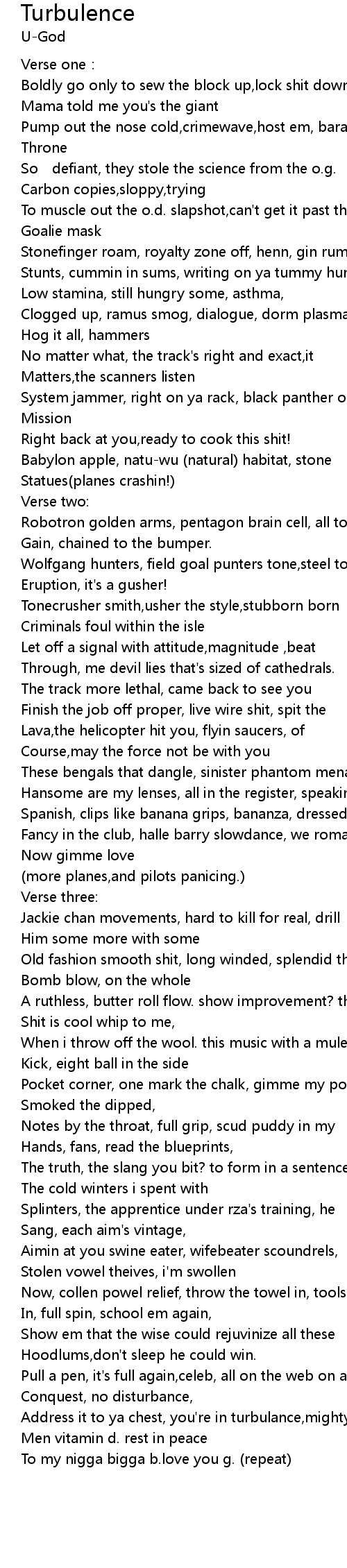 | Address it to ya chest, you' re in turbulance, mighty | |