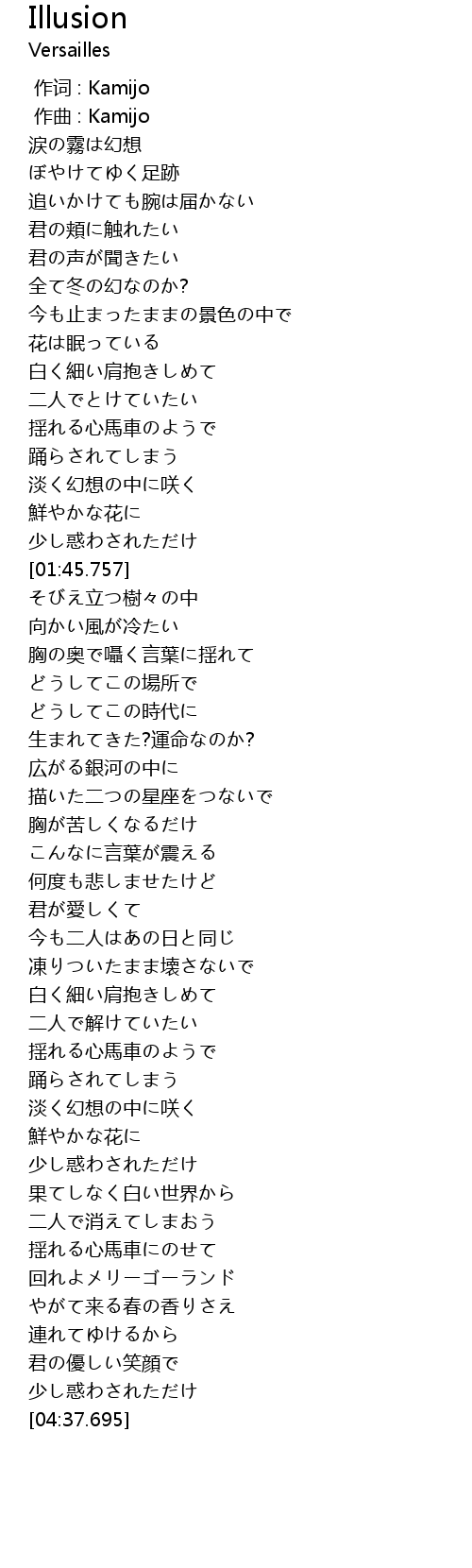 | [02:12.793] | 胸の奥で囁く言葉に揺れて |