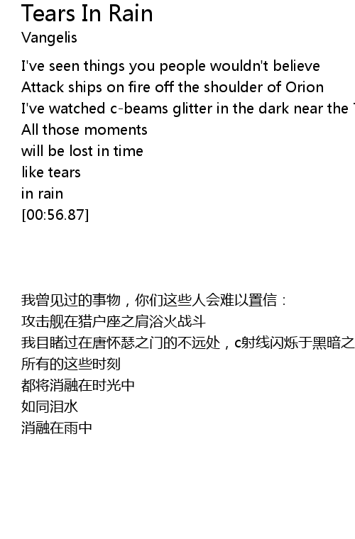 | [00:19.32] | 我目睹过在唐怀瑟之门的不远处,c射线闪烁于黑暗之中 |