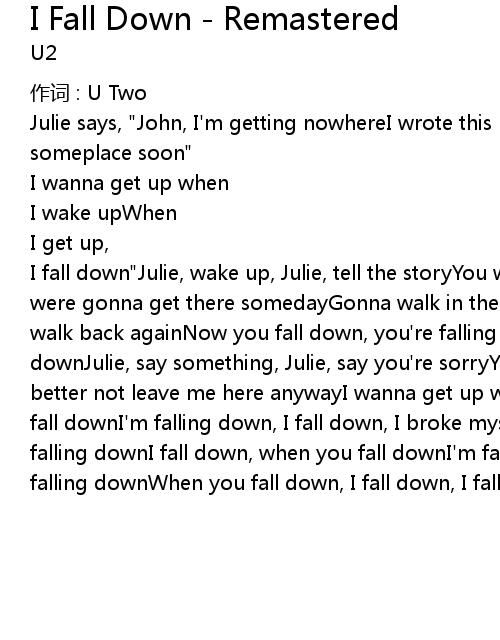 | I fall down" Julie, wake up, Julie, tell the storyYou wrote the letterSaid, you were gonna get there somedayGonna walk in the sunAnd the wind and the rainNever walk back againNow you fall down, you' re falling downYou fall down, you fall downJulie, say something, Julie, say you' re sorryYou' re gonna get betterYou better not leave me here anywayI wanna get up when you wake upWhen I get up, I fall downI' m falling down, I fall down, I broke myselfI fall, I fall down, I' m falling downI fall down, when you fall downI' m falling down, is when you' re falling downWhen you fall down, I fall down, I fall down |