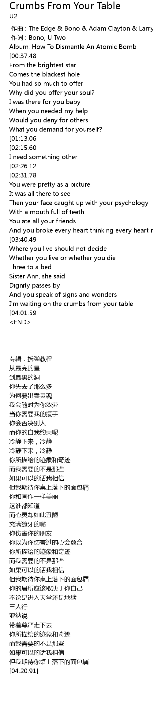 | [01:34.13][02:31.78] | But I' m waiting on the crumbs from your table |