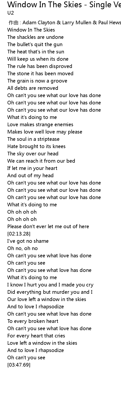 | [00:00.00] | 作曲 : Adam Clayton & Larry Mullen & Paul Hewson & Dave Evans |