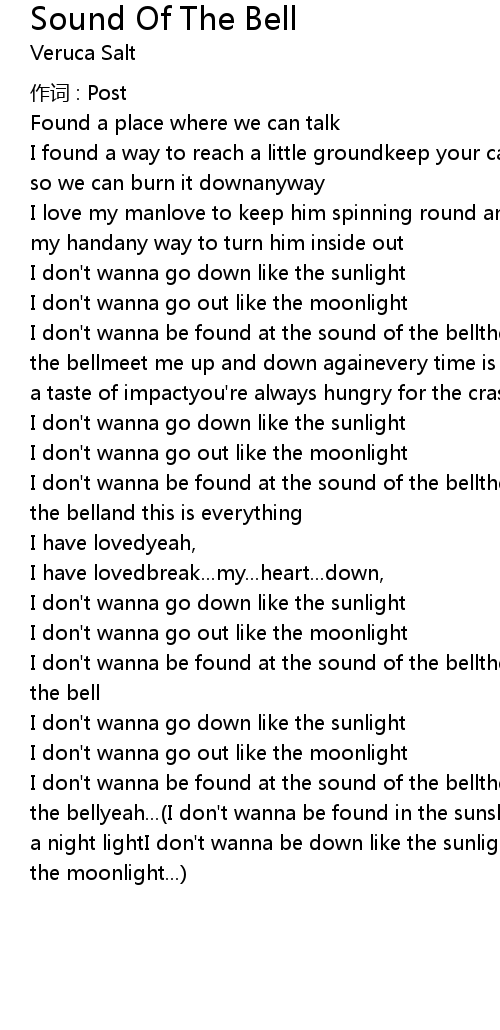| I don't wanna be found at the sound of the bellthe sound of the bellthe sound of the bellyeah...(I don't wanna be found in the sunshineI don't wanna be dim like a night lightI don't wanna be down like the sunlightI don't wanna go out like the moonlight...) |