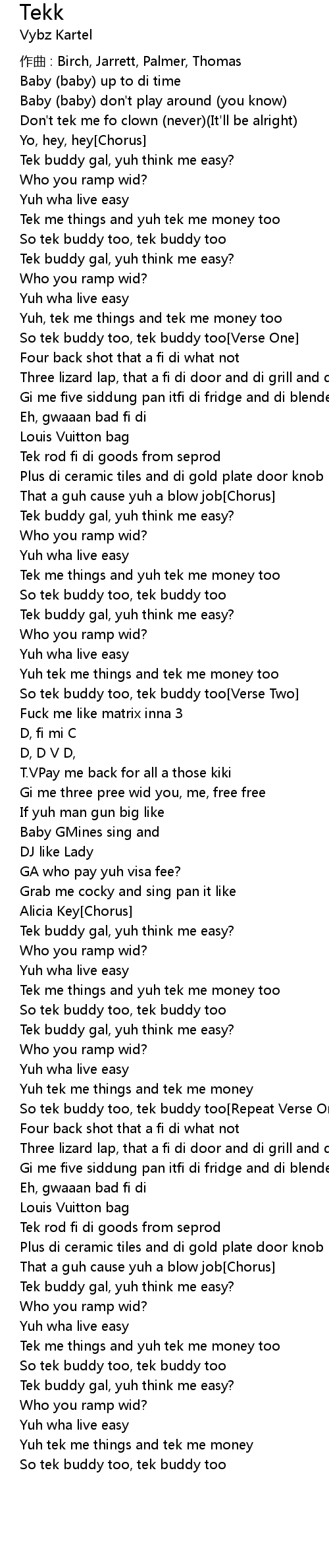 | So tek buddy too, tek buddy too[Repeat Verse One] | |