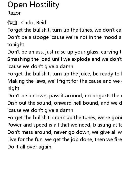 | Dish out the sound, onward hell bound, and we don't need to hear from you man 'cause we don't give a damn | |