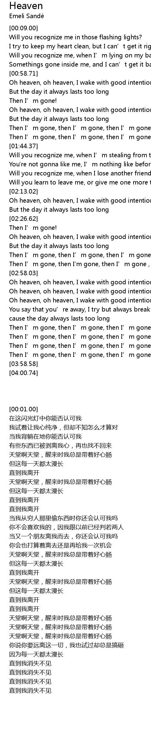 | [02:59.12] | Oh heaven, oh heaven, I wake with good intentions, |