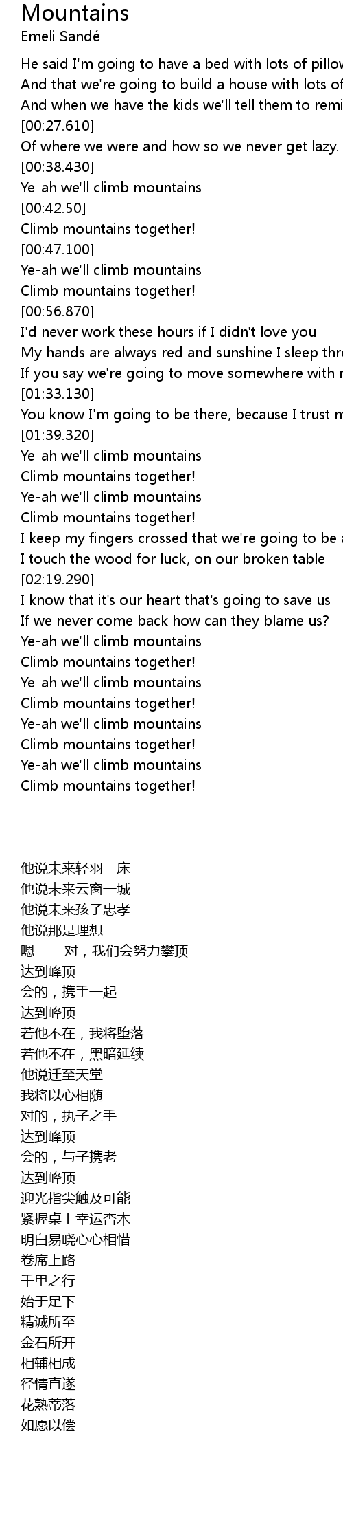| [00:39.490] | Yeah we' ll climb mountains |