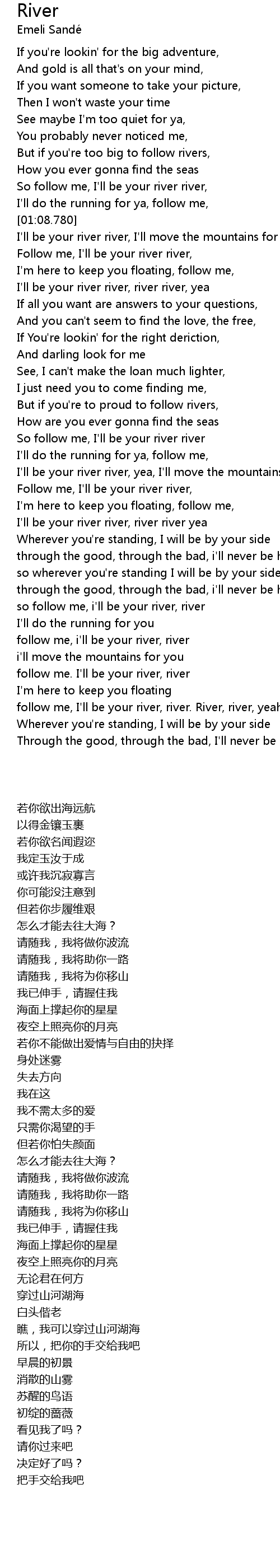 | [00:57.270] | So follow me, I'll be your river river, |