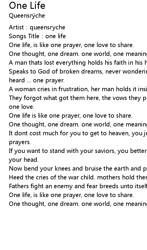 | [01:22.29] | Speaks to God of broken dreams, never wondering why when nothings heard ... one prayer. |