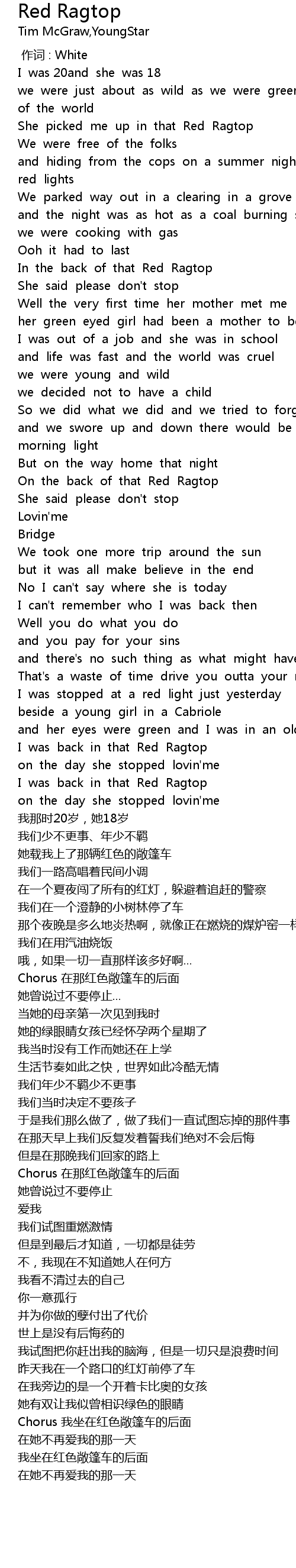 | [00:18.28] | She picked me up in that Red Ragtop |