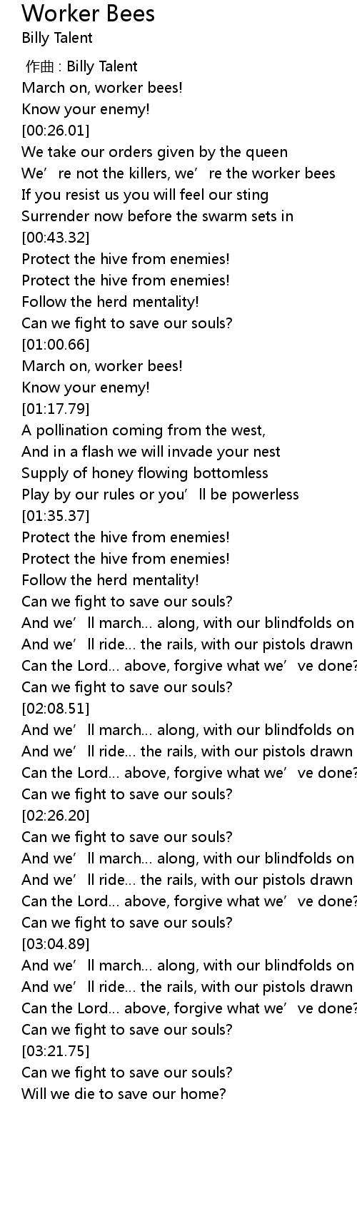 | [00:30.45] | We' re not the killers, we' re the worker bees |
