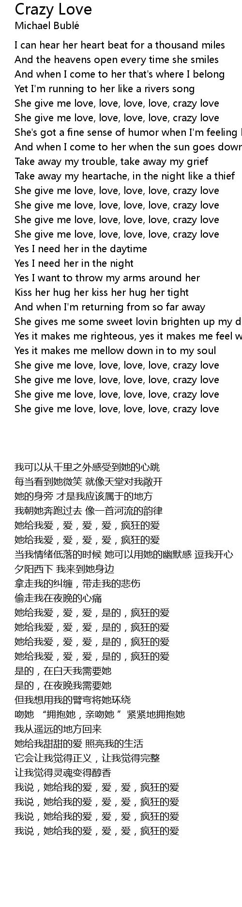 She give me love, love, love, love, crazy love |