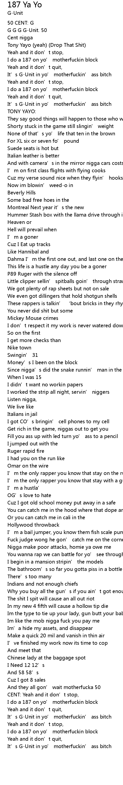 | It’s G-Unit in yo’ motherfuckin’ ass bitch | |