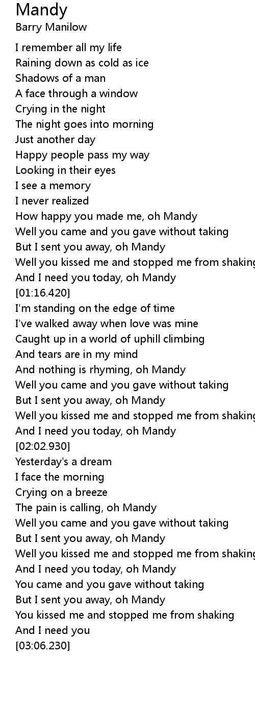 | [01:40.479] | And nothing is rhyming, oh Mandy |