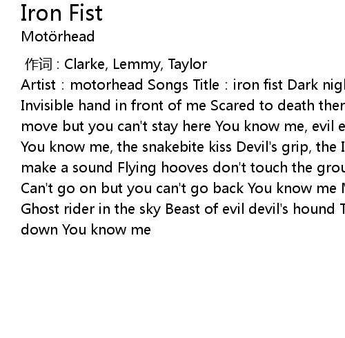 | [00:00.96] | Artist: motorhead Songs Title: iron fist Dark night nothing to see Invisible hand in front of me Scared to death there' s someone near Scared to move but you can' t stay here You know me, evil eye You know me, prepare to die You know me, the snakebite kiss Devil' s grip, the Iron Fist Flying horse don' t make a sound Flying hooves don' t touch the ground Walk in circle lose you track Can' t go on but you can' t go back You know me Moon eclipse and you know why Ghost rider in the sky Beast of evil devil' s hound Tooth and claw they pull you down You know me |