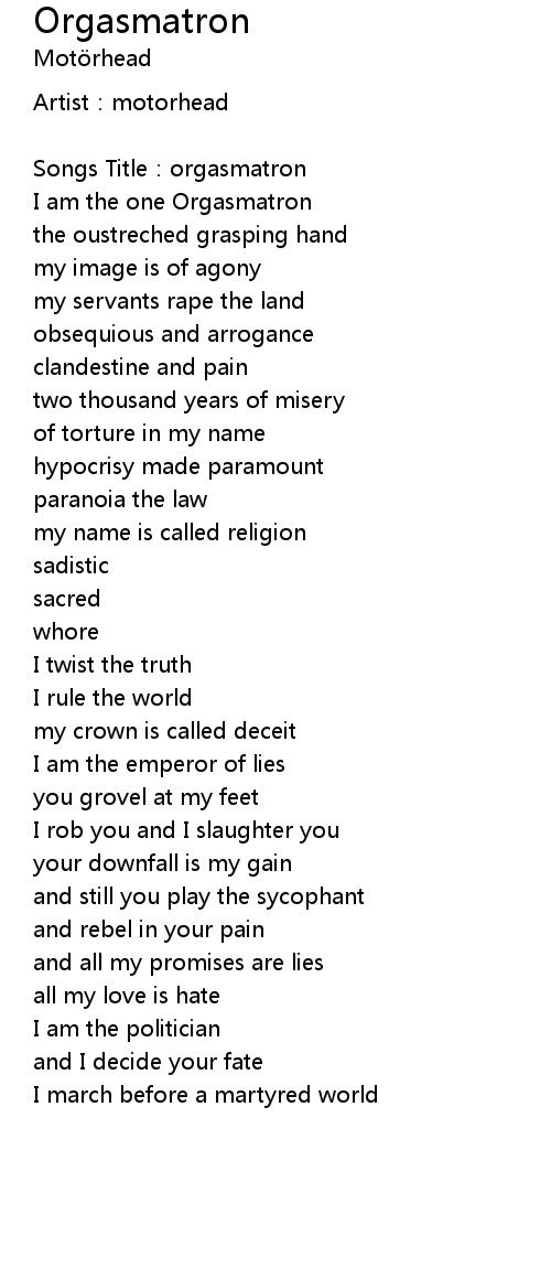 | [00:03.01] | I am the one Orgasmatron |