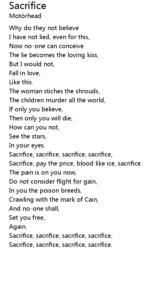 Sacrifice, pay the price, blood like ice, sacrifice. |