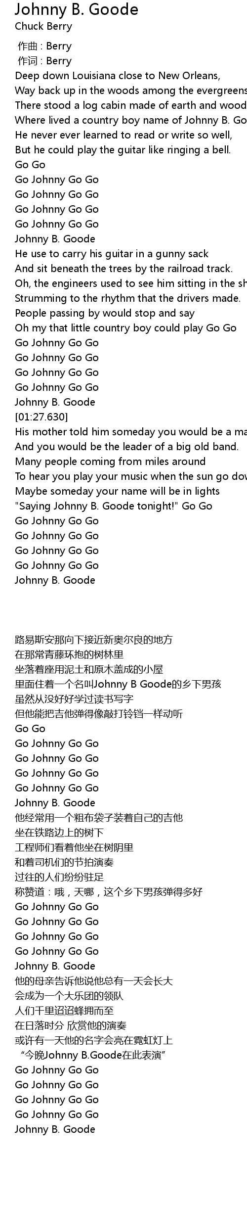 | [00:26.400] | Where lived a country boy name of Johnny B. Goode... |