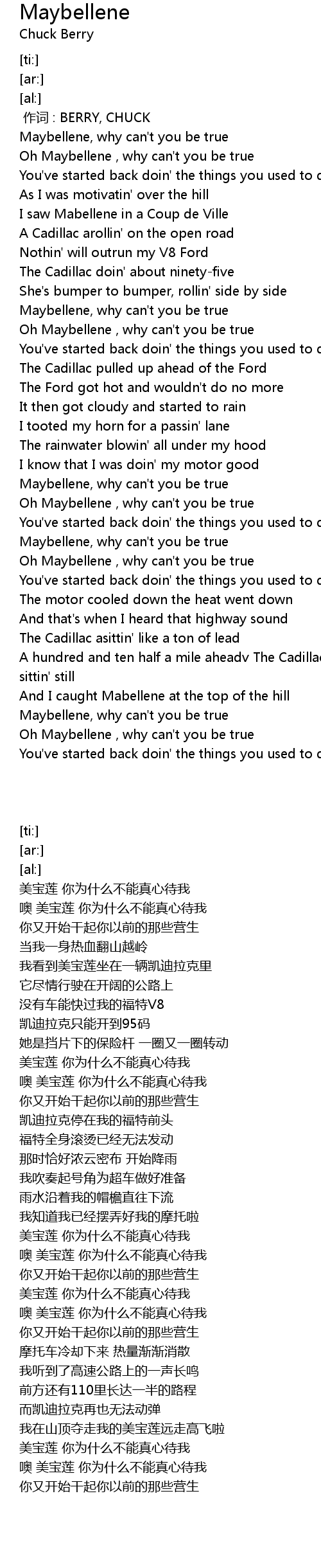| [01:33.70] | Oh Maybellene , why can' t you be true |