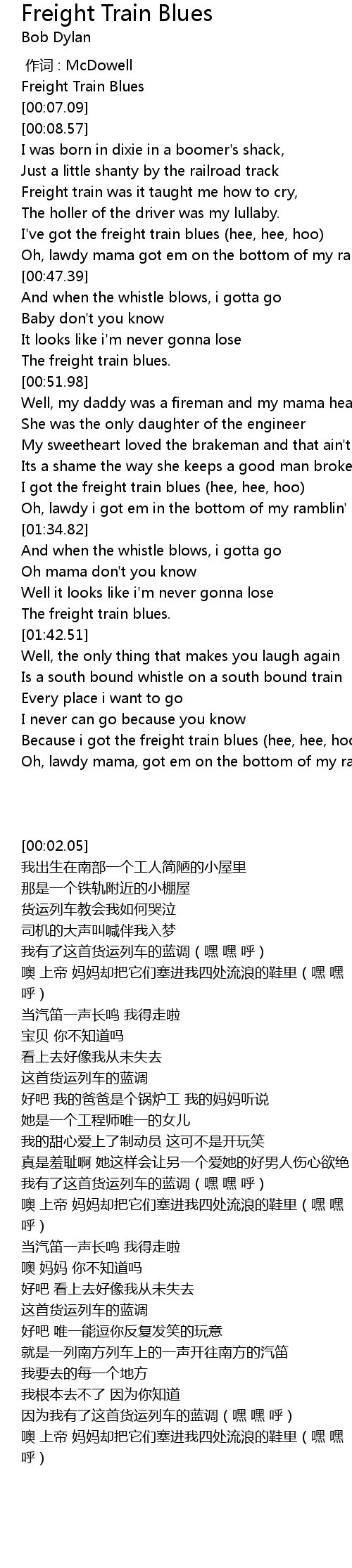 | [00:02.05] | Freight Train Blues |