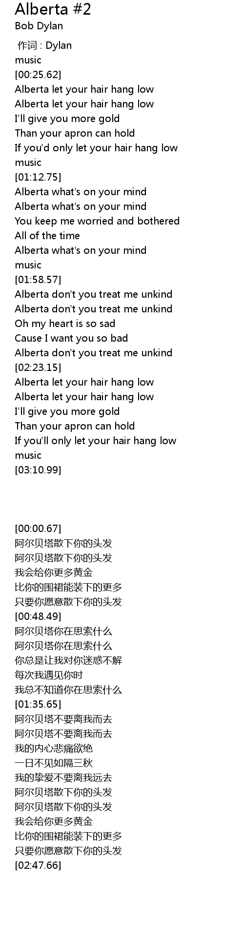 | [02:01.15] | Alberta don' t you treat me unkind |