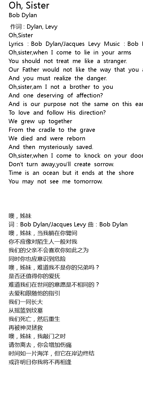 | [00:36.254] | Oh, sister, when I come to lie in your arms |