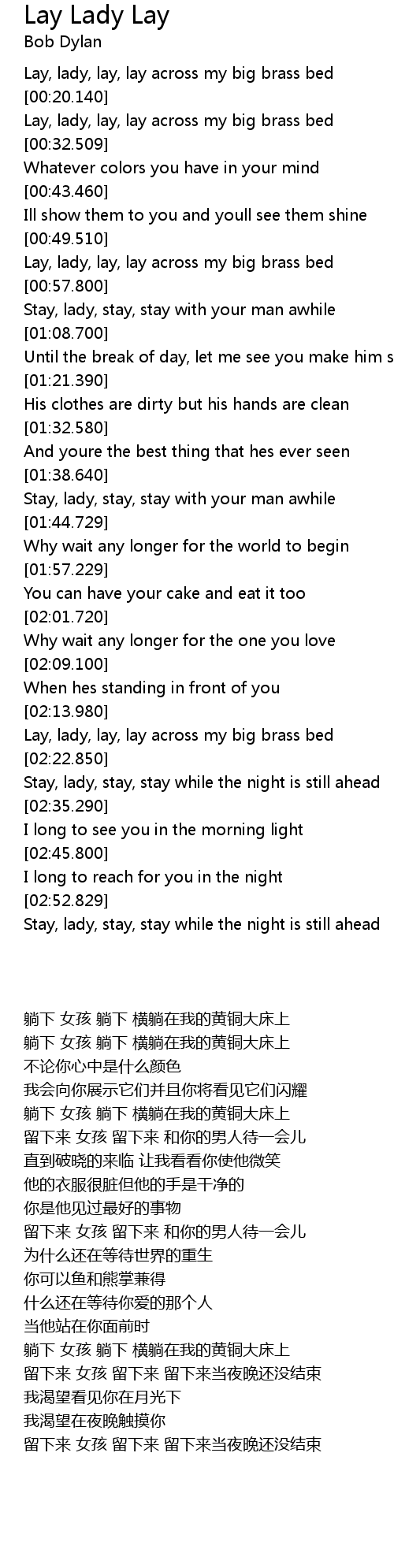 | [02:18.290] | Lay, lady, lay, lay across my big brass bed |