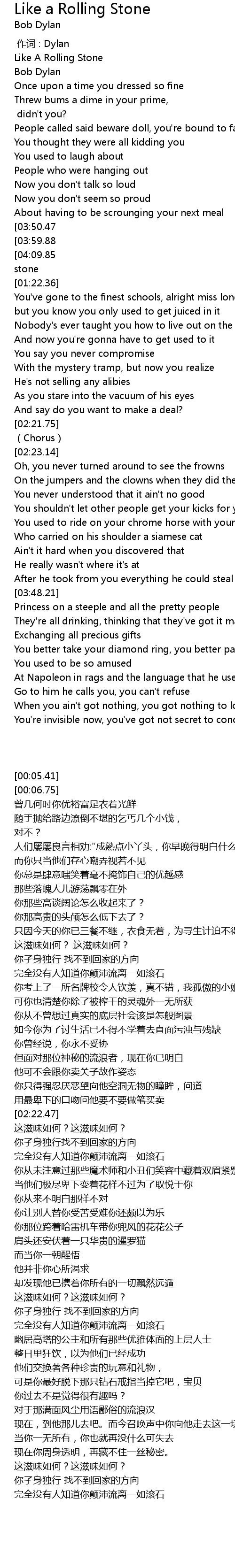 | [05:37.17][04:09.85][02:41.28][01:15.06] | Like a complete unknown, like a rolling stone |