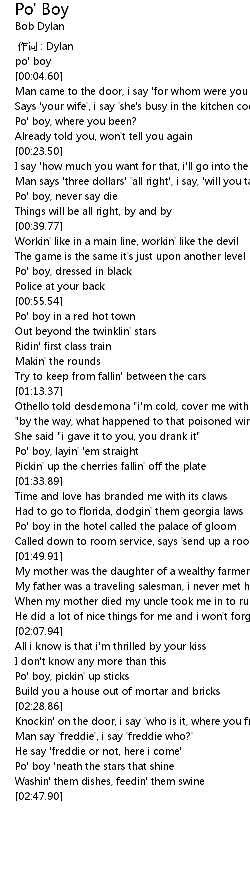 | [02:38.84] | Po' boy ' neath the stars that shine |